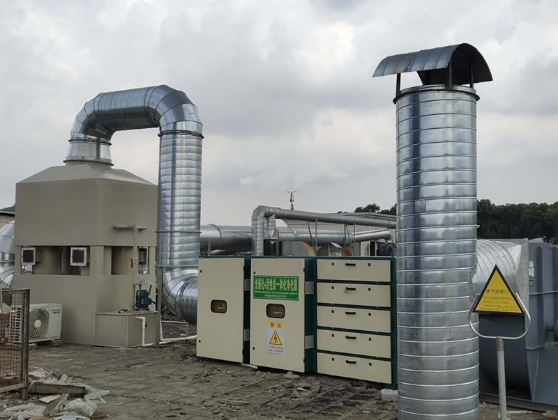 喷淋室内喷淋液经过雾化器的雾化形成层层水膜,首先废气由喷淋塔进气口流入空气室,然后经过层填料进行水洗,去除废气中的40%-60%的粉尘、塑胶颗粒以及溶解部分溶于水的废气,然后进入第二层填料进行水洗,完全去除废气中全部的粉尘、塑胶颗粒和溶解部分溶于水的废气(防止塑胶颗粒粘结灯管,影响光氧设备净化效率和后续设备的维护成本)。然后经水喷淋上端的除雾器进行水份吸收。接着废气进入光氧催化设备。