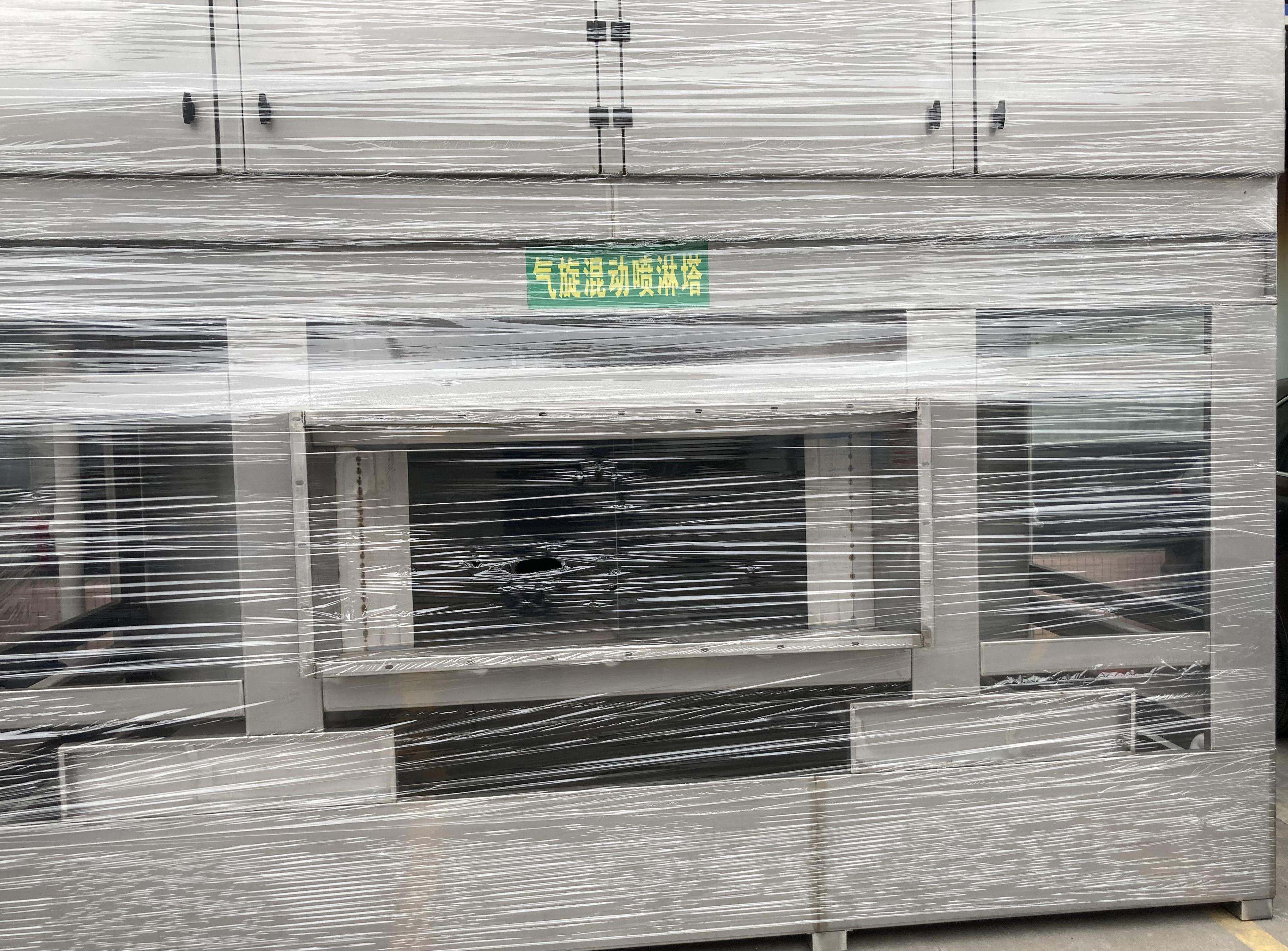 原理简述:气旋喷淋塔在离心力作用下,含尘气体呈横向向心运动,含尘气体停留时间更长,洗涤效果更好,彻底改善了喷淋塔在某些特定工况下存在的除尘不彻底、水喷淋塔容易堵塞等技术缺陷。产品采用专利技术,避免水泵及喷头的堵塞,大大提高生产效率,其中水池的水可循环使用,避免产生二次污染造成的困扰,更节约了水资源。开云app官方在线入口内安装有1个或2个“圆形旋流桶”和高效除雾板。旋流桶内放有实心填料球,上层的除雾板用来净化水雾,达到脱水雾的目的,含尘气体在塔内旋流上升、并在各板上与由塔顶进入的液体旋流接触,完成除尘任务;通过离心力的作用,废气中的大颗粒沉入水池, 由人工捞出清理机壳,这样气体得到净化,同时开云app官方在线入口内的水可以继续循环使用。